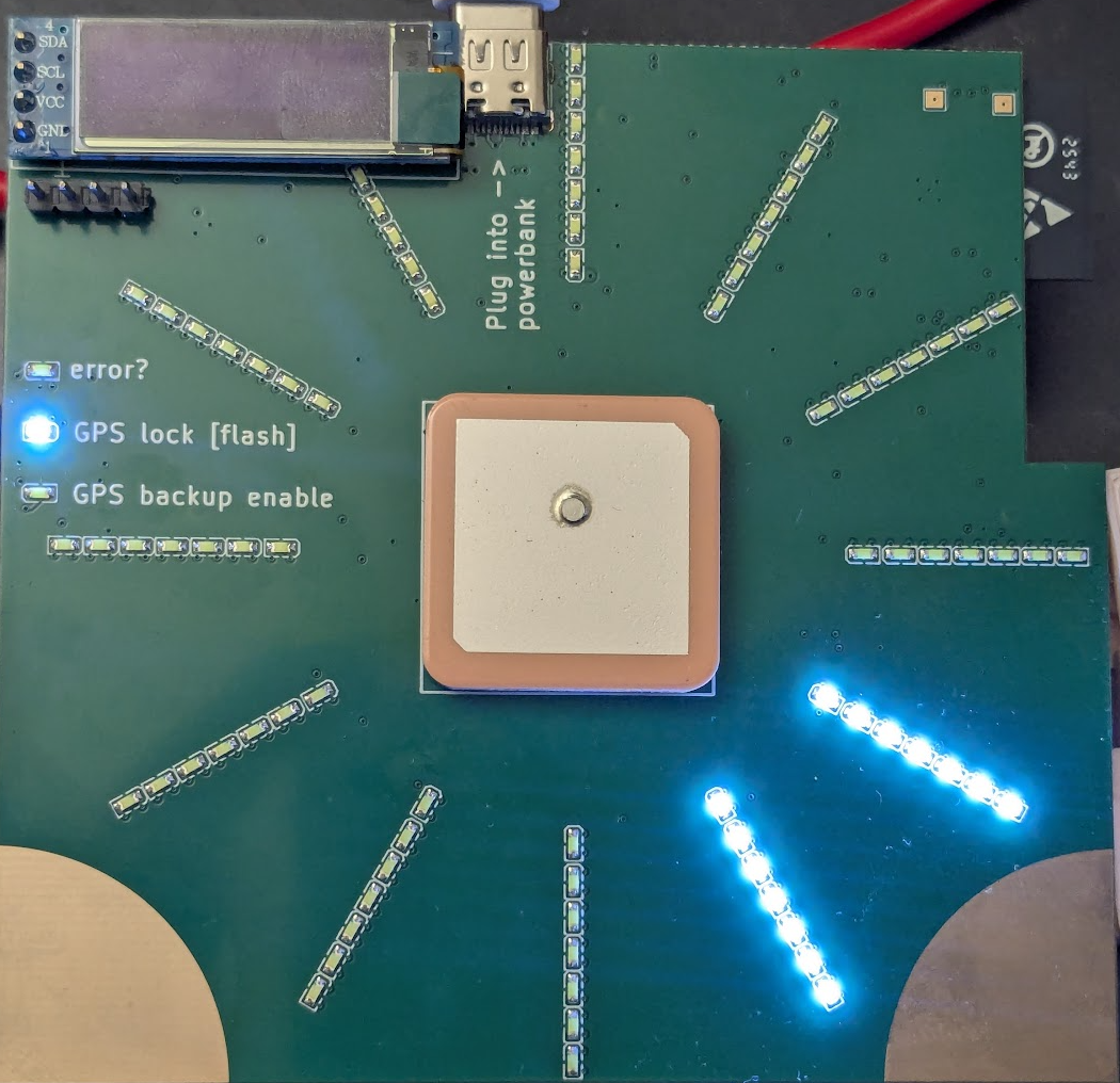 I finally decided to add LED interpolation, whereby the brightness would be interpolated between two adjacent LED bars based on the true heading of the compass, rather than snapping to the nearest bar. It took ages for mr Claude to get this right, and it ended up taking the i2c peripheral to send out sychronous gpio edges on all relevant gpio lines. This was because otherwise you have to to time-slicing between two adjacent LED’s, since it’s not possible to light up only two LED’s at once in an LED matrix, if the LED’s share neither a row nor a column: