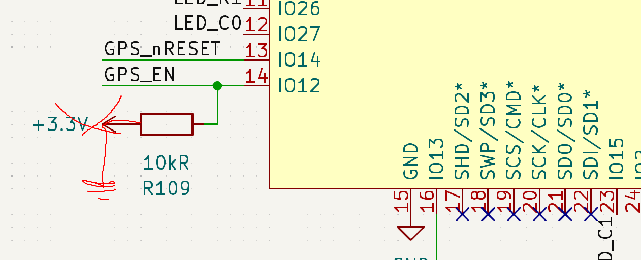 When I pasted the schematics in for a design review, gemini also pointed out that GPIO 12 was read on bootup to set the voltage of the internal flash, and so I could not use it to drive the LED matrix. Nice catch. I don’t know if I read the subsequent recommendation properly, but anyway I put a pullup on IO 12 when I should have put a pulldown instead. oh well.