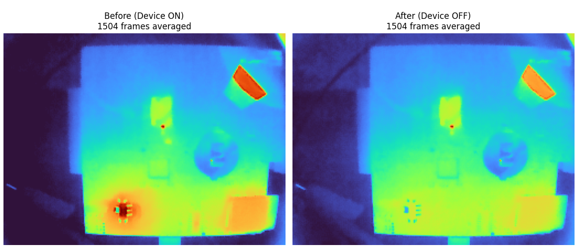 - power the above off the 3.3v rail directly to eliminate the linear regulator: same, 20mA Here is what the diff thermal image has to say after the above desoldering whilst powering the board of the 3.3v rail: