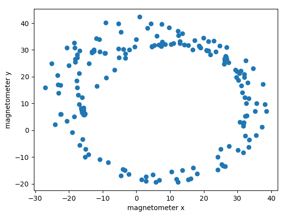 The compass seemed like it was working reasonably well earlier after I implemented the code that reset/flipped the measurement each time to cancel out the bias. But after getting on a plan and waiting a few days, the measurements are back to pretty useless. Here is a scatter plot of the measurements over the x/y axes when rotating the compass: