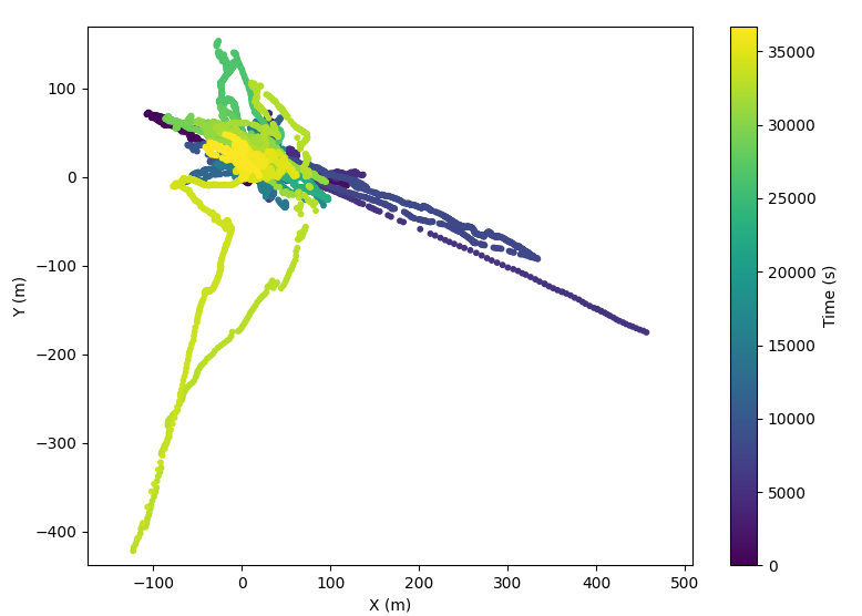 This doesn’t seem to work though. A further investigation plotting the GPS position as a function of time overnight with the PCB sitting on a desk gives this result: