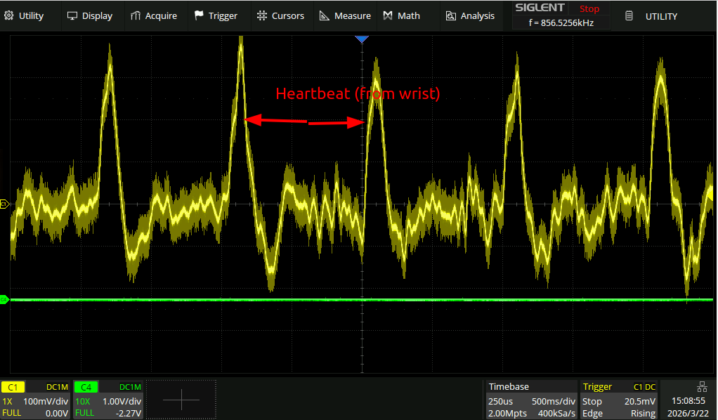 Hooking it up to the scope, I can see my heartbeat in my wrist quite clearly: